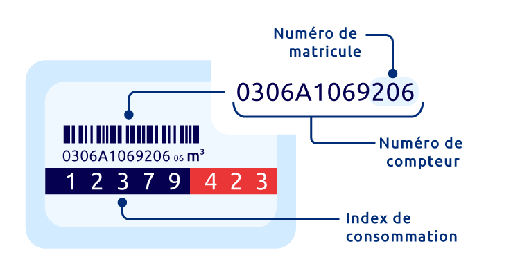 Pour récupérer le matricule du compteur, vous devez identifier le numéro de série du compteur (suite de 14 caractères, lettres et chiffres). Le numéro de série se retrouve au-dessus de l’index de consommation. Retenez ensuite les 3 premiers chiffres des 5 derniers.